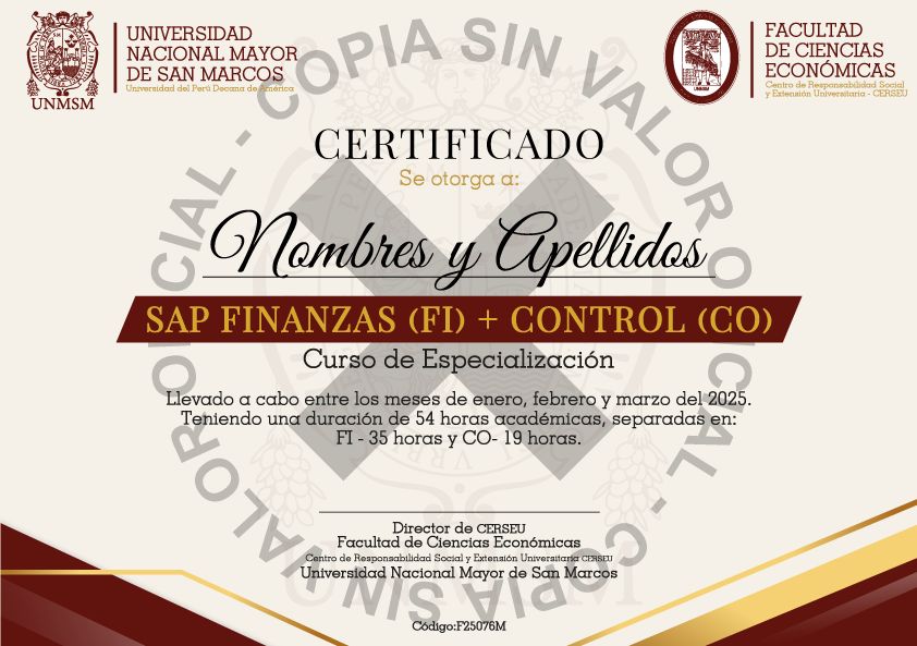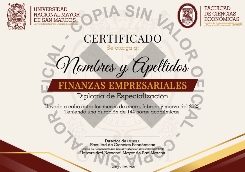 En cada diploma o curso de especialización cuyo programa culmines con nota aprobatoria (consultar por la mínima nota aceptada) se entrega al alumno o alumna un Certificado de Estudios siendo la constancia de haber realizado una formación académica firmada por la Facultad de Ciencias Económicas de la Universidad Nacional Mayor de San Marcos y su Centro de Responsabilidad Social y Extensión Universitaria (CERSEU).